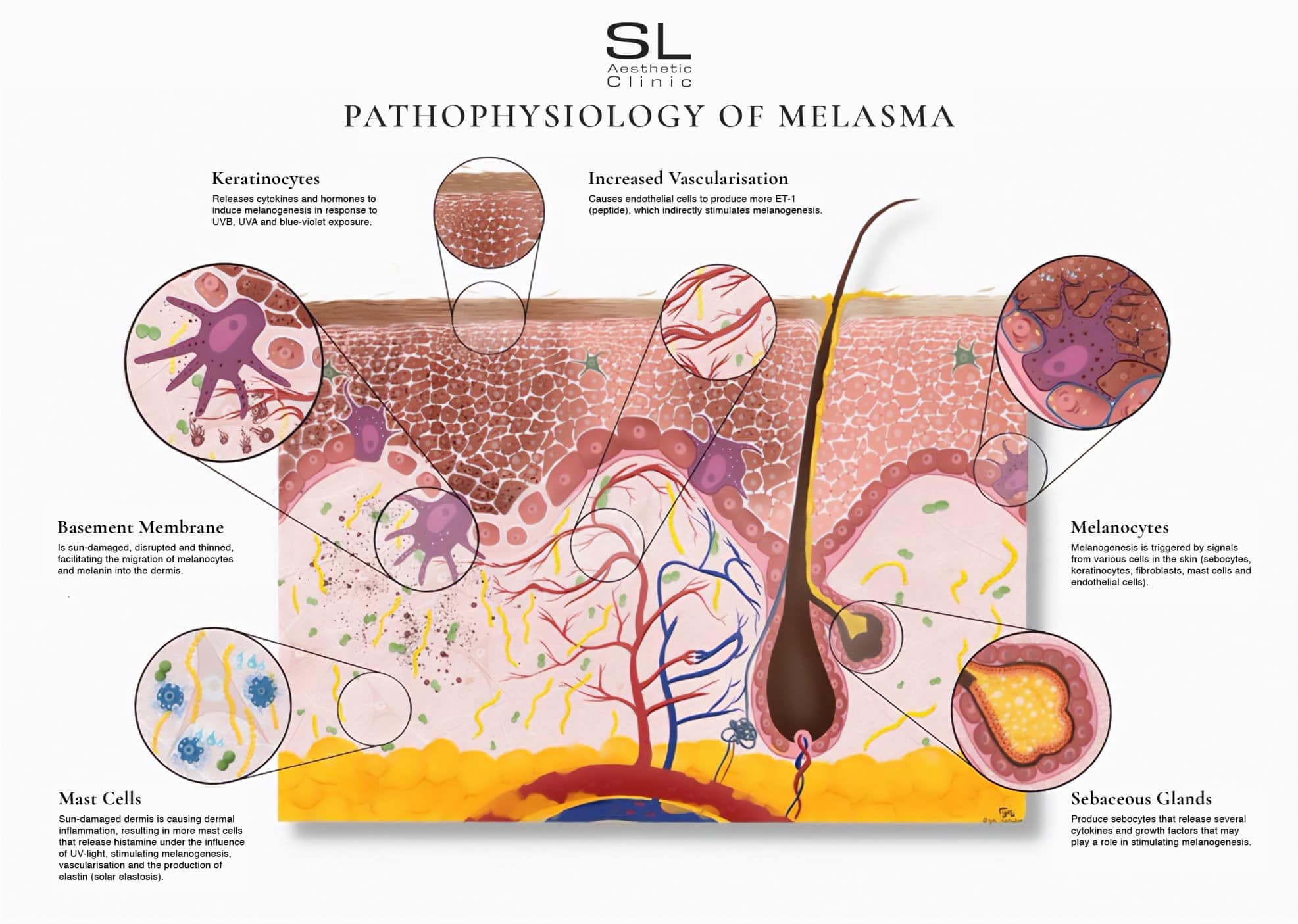 Melasma occurs when melanocytes, the pigment-producing cells in the skin, become overactive and produce too much melanin (the pigment that gives skin its colour).